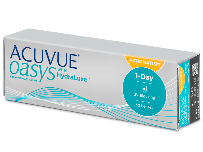 Esta caixa de Acuvue Oasys 1-Day with HydraLuxe for Astigmatism contém 30 lentes diárias.